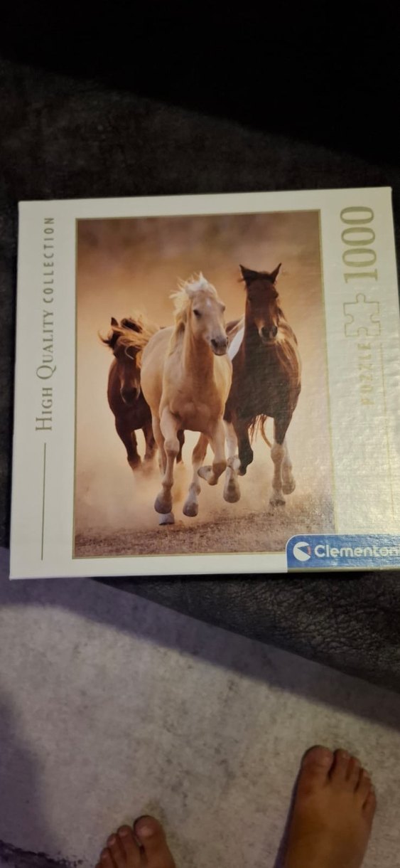Clementoni markasının parlak deve renkli 1000 parçalı koşan atlar temalı puzzle'ı.