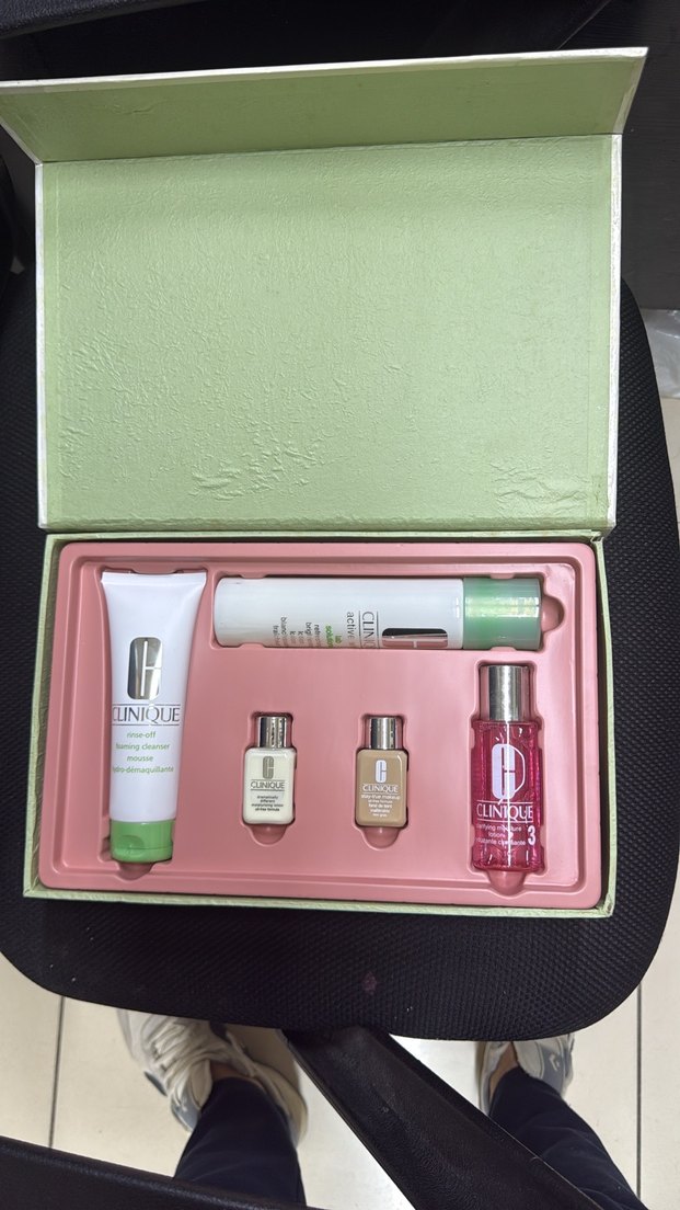 Clinique cilt bakım seti, temizleyici, nemlendirici ve tonik içerir. Cilt sağlığını ve görünümünü iyileştirmeye yardımcı olur.
