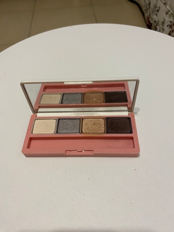 Bej, gri, kahverengi ve koyu kahverengi tonlarında dört renkli göz farı paleti. İçinde ayna bulunmaktadır.
