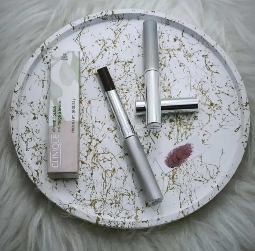 Clinique marka, doğal görünümlü, kremamsı dokulu khaki renk ruj, şık gümüş kapaklı ambalajda.