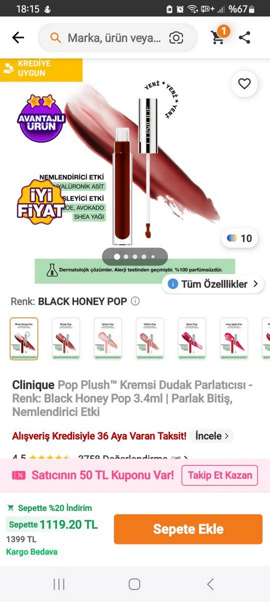Clinique Pop Plush kremli dudak parlatıcısı, Black Honey Pop renginde parlak bitiş ve nemlendirici etki sağlar. Shea yağı, avokado ve hyaluronik asit içerir. Dermatolojik olarak test edilmiştir.