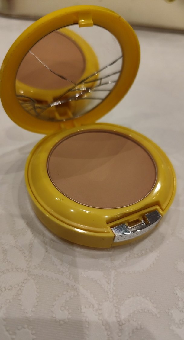 Sarı kapaklı, iç kısmında çatlak ayna bulunan bej parlak pudra.✨