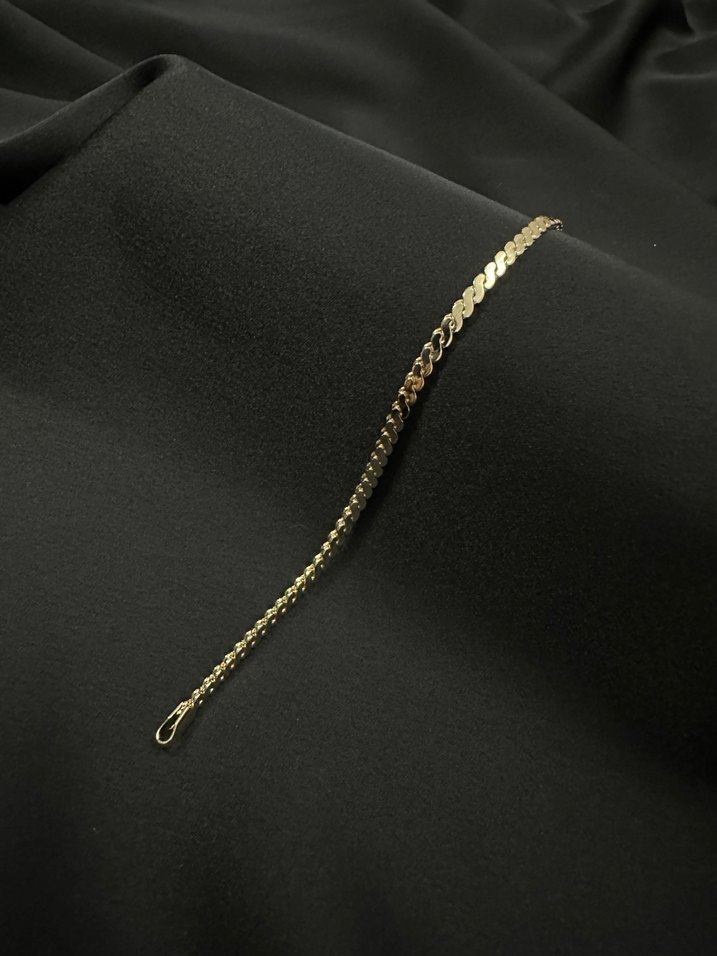 Kadın bilekliği, parlak altın renkli zincir ve zarif yılan deseni detayına sahiptir. Minimalist ve sade tarz için uygundur. Romantik akşamlar ve sokak modası için ideal. ✨