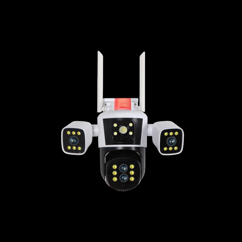 Beyaz renkli, çoklu lens ve LED ışıklı güvenlik kamerası, gelişmiş video 4MP, 4 adet 4MP Sensör H.265 Kodek 4mm+ 4mm+ 6mm+ 16mm 10X optik Zoom Analiz, Akıllı Gece Görüş,Çift Yönlü Ses, Wifi,P2P, Uzaktan Erişim IP66 Koruma Mobile app IPC360 Home ve gece görüşü sağlar.