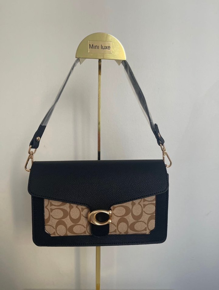 Miniluxe markalı, tokalı kapaklı siyah deri çanta, baskılı deseniyle klasik ve modern iş stilini birleştirir. Günlük kullanıma uygundur.