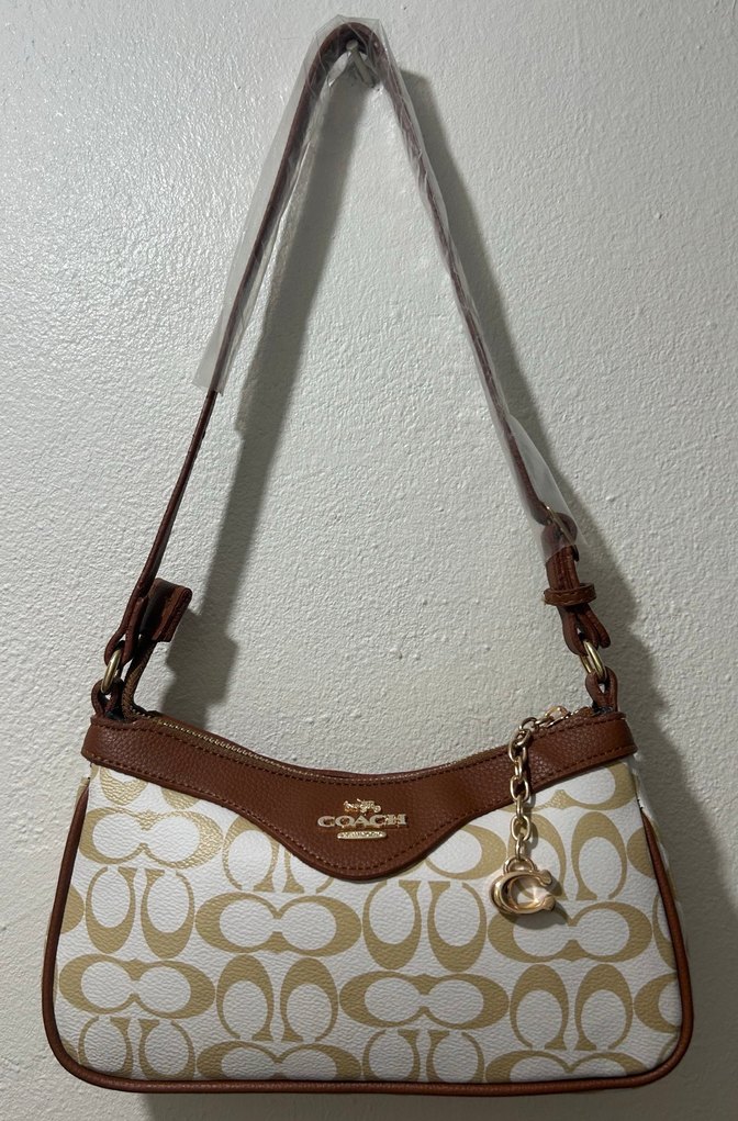 Bu Coach çanta, beyaz desenli deri gövde, kahverengi tokalı askılar ve altın renkli aksesuar içerir. Klasik zarafet ve modern stili birleştirir.