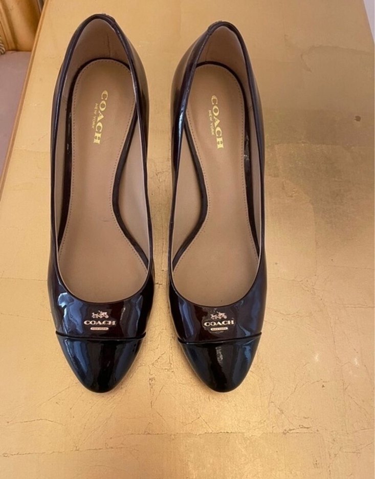 Coach markalı, kahverengi parlak yüzeyli, baskılı klasik topuklu kadın ayakkabısı, ofis kullanımı için uygundur.orjinal tertemiz dar geldiği için ekledim