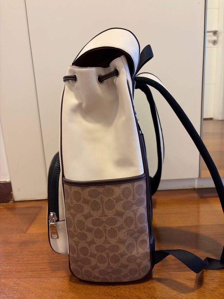 Krem ve kahverengi coach desenli deri detaylarla modern ve minimal tasarıma sahip, tokalı sırt çantası. Trendy ve günlük kullanıma uygun. Seyahatler içinde faydalı. Pek Kullanılmadı