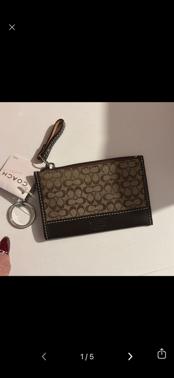 Coach marka, koyu kahverengi deri detaylı, baskılı desenli ve fermuarlı cüzdan. Bilek kayışı ve anahtarlık halkası içerir. Günlük kullanım için uygundur.