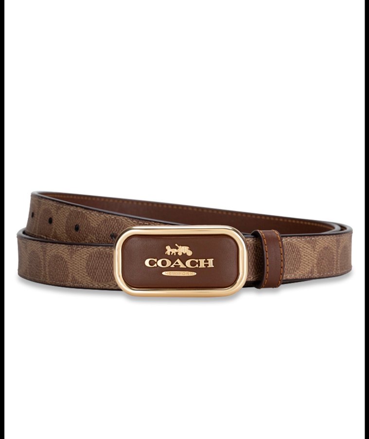 Coach marka kahverengi deri kadın kemer, bel detaylı ve altın tonlu logo tokasıyla klasik ve çağdaş bir tarz sunar.