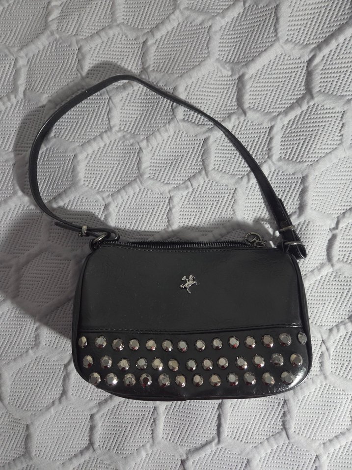 Tokalı ve zımbalı siyah deri çanta, rock punk tarzında. Günlük kullanıma uygun, grunge punk havası taşıyor.