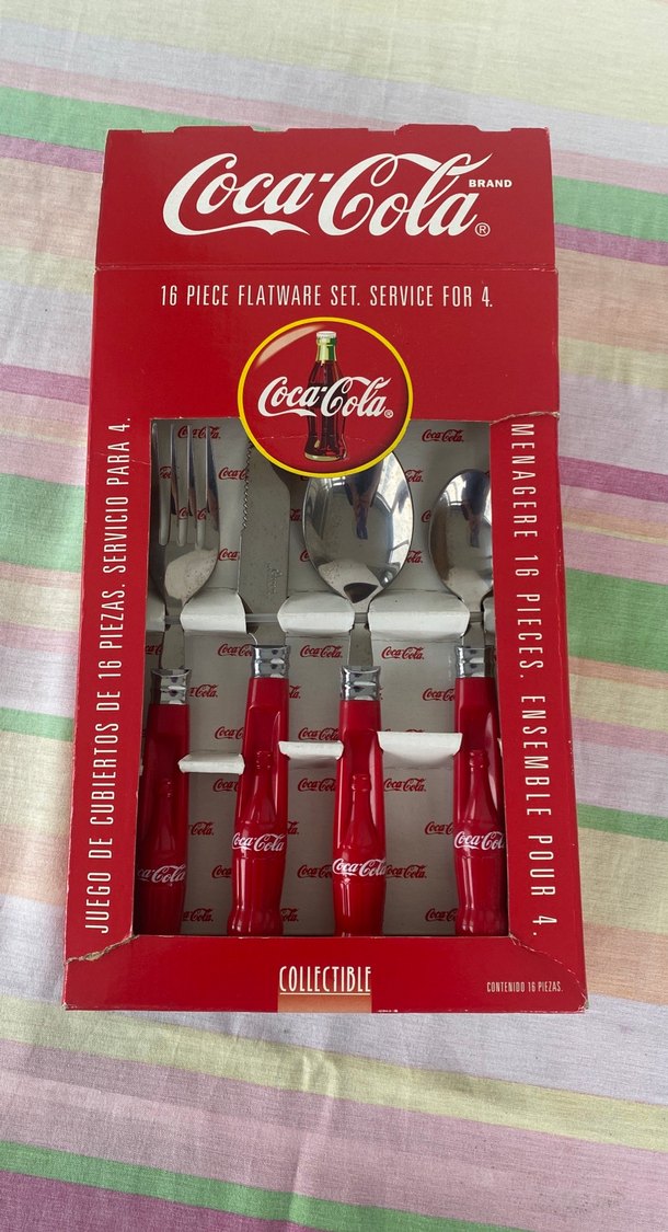 Coca-Cola koleksiyonluk 16 parçalık çatal, kaşık ve bıçak seti, 4 kişilik servis için kırmızı şişe şeklinde saplara sahip.orjinal yurtdışından alındı ve hiç kullanılmadı vintage #vintage#cocacola