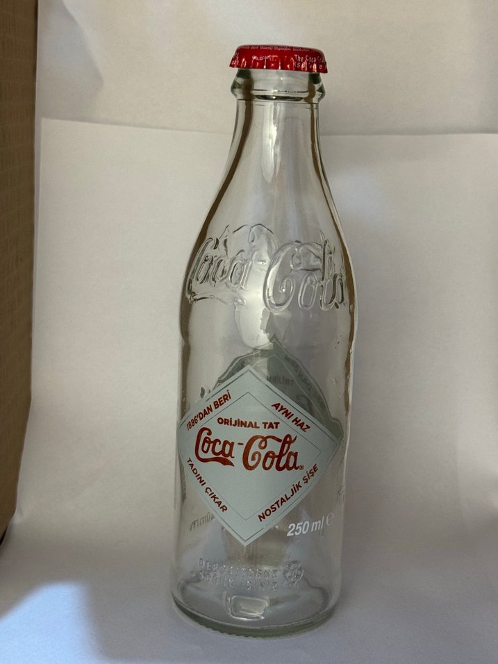 250 ml hacminde, Coca-Cola cam şişe, kırmızı kapaklı. Nostaljik bir tasarıma sahip.