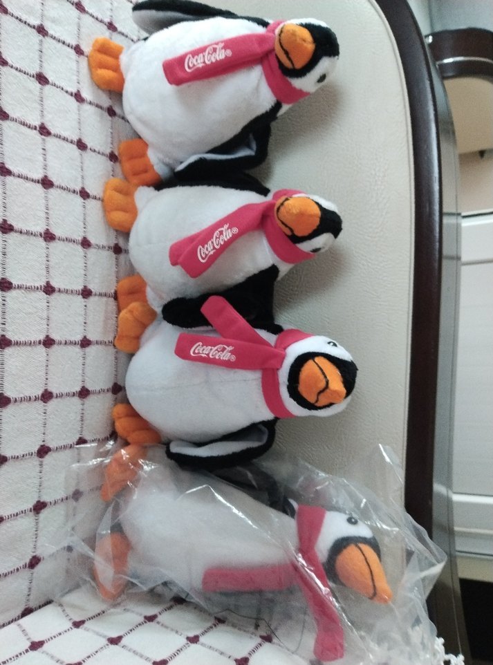 CocaCola logosu bulunan, beyaz, siyah ve turuncu detaylı renkli peluş penguen oyuncakları. Yumuşak ve koleksiyonluk.4 tanesi 400 tl