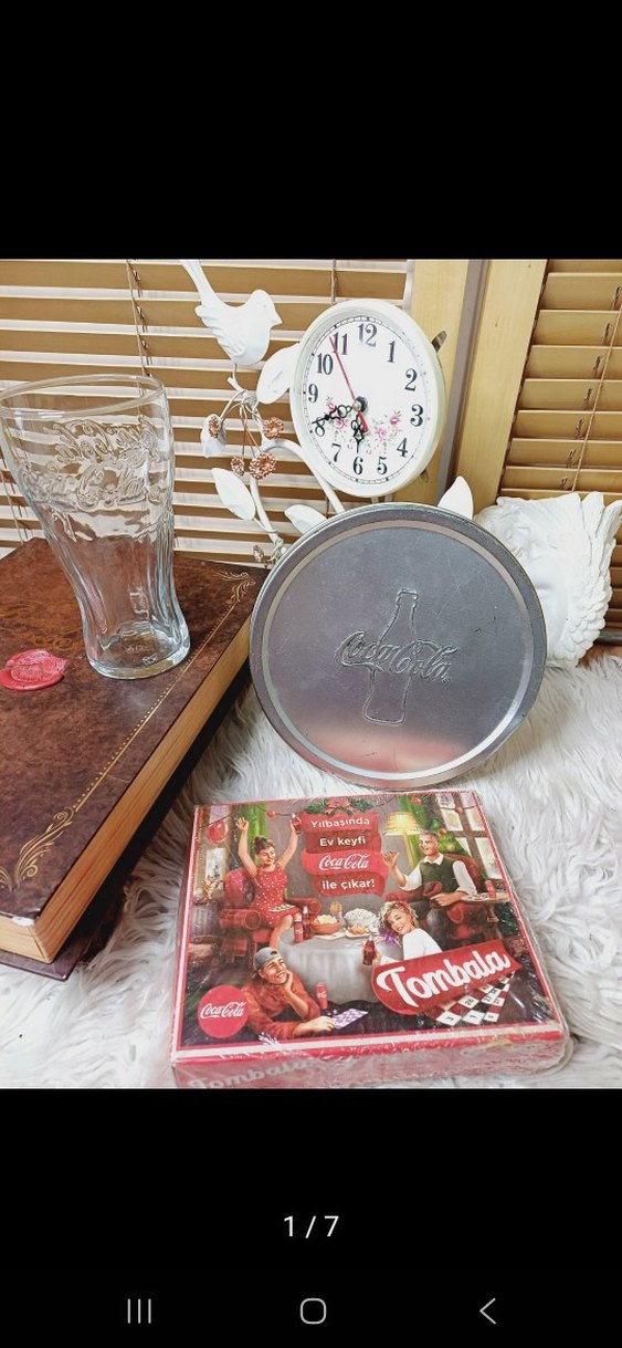 Beyaz ve gri renklerde, çiçek desenli masa saati ve CocaCola kabartmalı cam bardak içeren set. Saatin üzerinde kuş figürü bulunur. alan kisiye hayırlı olsun resimde görüldüğü gibidir ölçüleri bellidir her tarafını çekmeye çalıştım