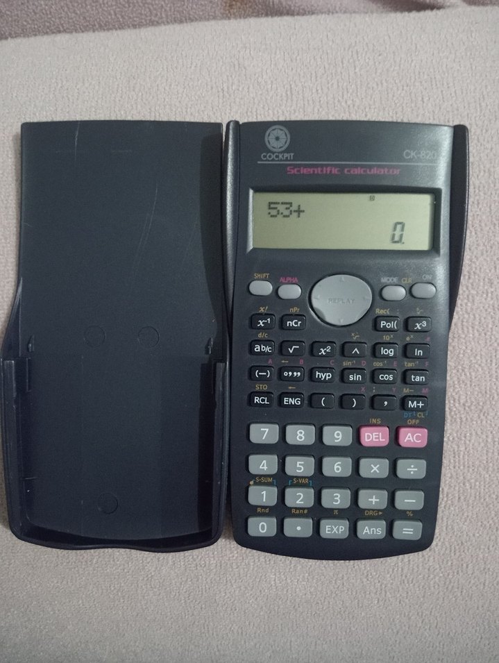 Cockpit CK-200 bilimsel hesap makinesi koyu gri renkli, koruyucu kapaklı ve 53+ gibi işlemleri gösteren net ekrana sahip. #bilimsel hesap makinası