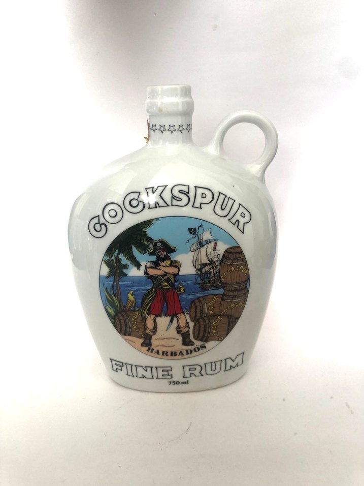 750 ml seramik şişede, korsan temalı tasarıma sahip Cockspur Fine Rum. Kolay dökme için kulplu şişe.
