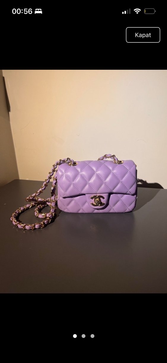 Pastel mor renkte, zincir detaylı deri kadın çanta. Kapitone deseniyle şık ve günlük kullanıma uygun.