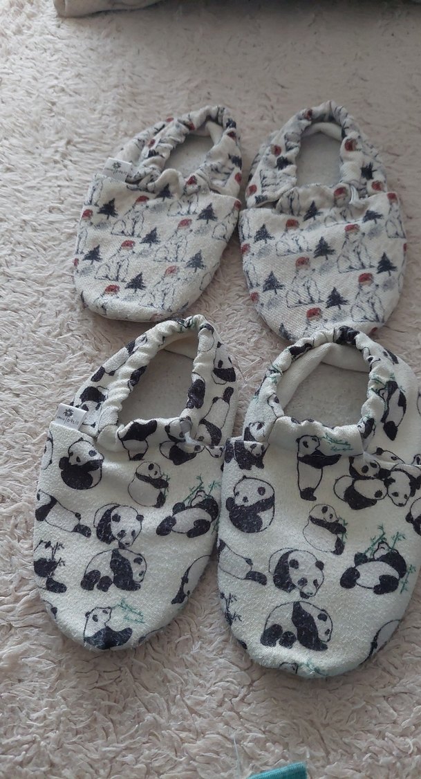 Örgü desenli, yumuşak ve sıcak kumaştan erkek bebek ev patikleri. Beyaz ve gri tonlarda, panda ve ağaç desenli, rahat ve konforlu.