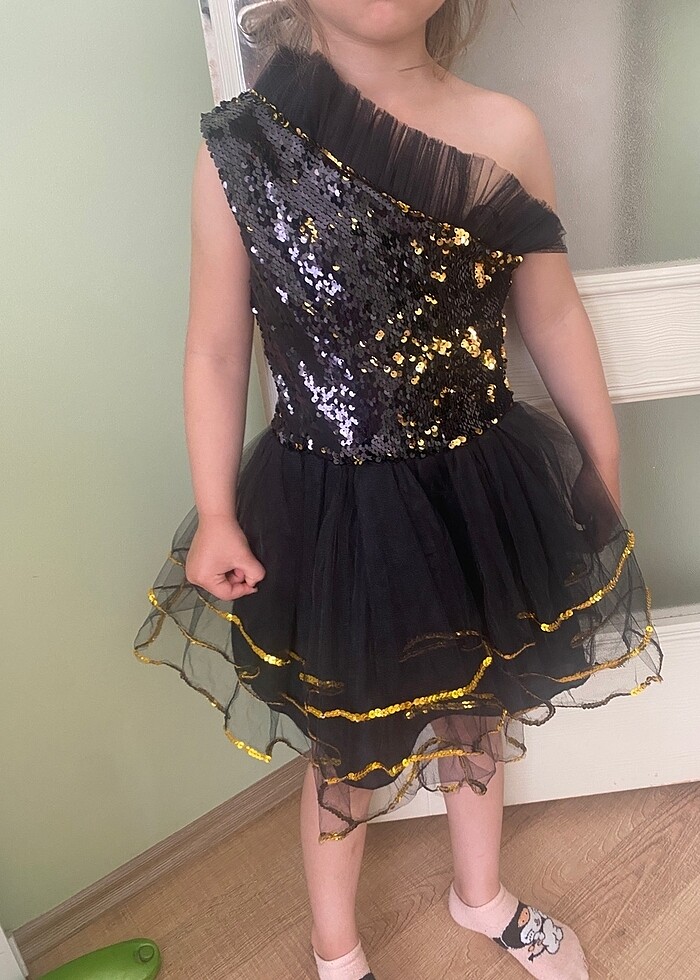 Sarı siyah yanar döner pullu Kız çok abiye Etiketi 2 yaş 3 yaş civarı olur Fotoğraftaki kızım 5 yaşında 19 kilo elbise net görünsün diye çektim