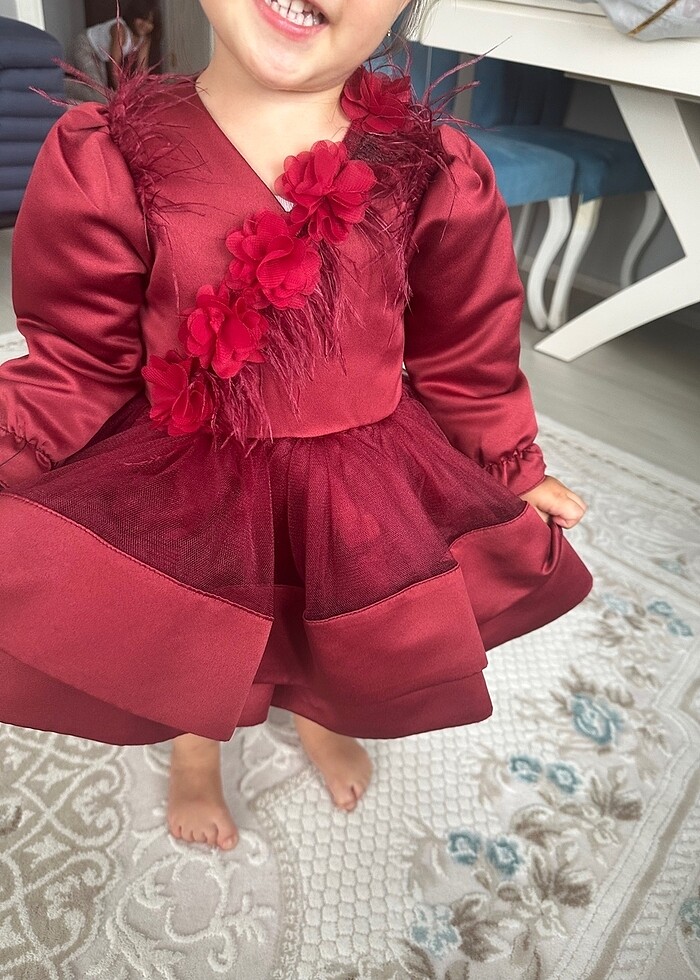Özel dikim olan bordo renkli kıyafetimizin bir çiçeği düşmüş fotoğrafta belli oluyor. 1 yaş çekimi için kullanılan kıyafet şuan 2 buçuk yaşında ki çocuğa görseldeki gibi biraz dar ve kısa oluyor