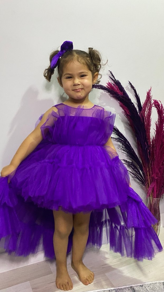 Her yaşa özel vardır Koyu mor renkte, fırfırlı detaylı, askısız ve bol kesim çocuk abiye elbise. Sentetik kumaştan, canlı batik desenli ve askılı kol detaylıdır.
