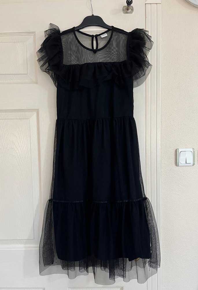 Siyah renkli, volan detaylı ve bol kesim uzun elbise. Askılı kollu, yuvarlak yakalı ve transparan üst kısmıyla parti elbisesi. Çok az kullanıldı. Defosu yoktur.