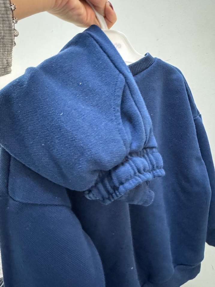 Koyu mavi kadın sweatshirt, kapüşonlu, uzun kollu ve düğme detaylıdır. Yumuşak kumaştan, rahat ve salaş kesimlidir. Günlük kullanım için uygundur.