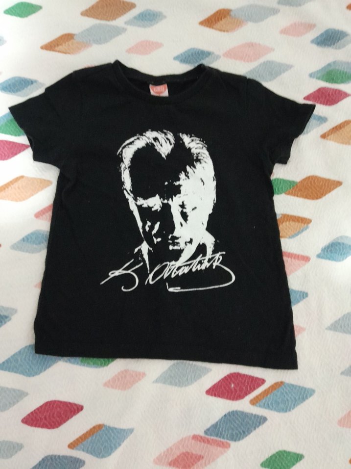 Pamuklu, kısa kollu, bisiklet yaka, siyah renkli ve Atatürk baskılı, 10 kasımda 1 kez giydi yıkandı çocuk tişörtü. 24 36 ay