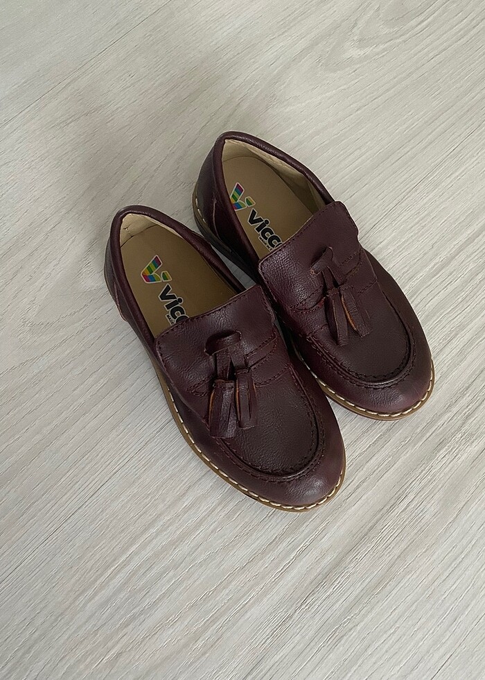 Vicco marka çocuk ayakkabısı hiç giyilmedi büyük geldiği için saklamıştık ancak baza altında unutulmuş. Sıfır üründür. Baza altında olduğunu için şekli bu şekilde giyildikçe düzelecektir. Kahverengi ile bordo arası bir renk