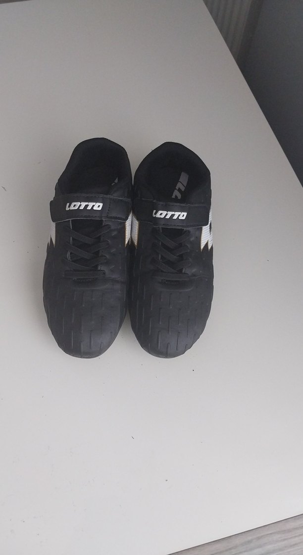 Siyah erkek futbol ayakkabısı, velcro bantlı ve kauçuk tabanlıdır. Spor ve streetwear tarzına uygundur. Üzerinde 'LOTTO' markası bulunur. ⚽