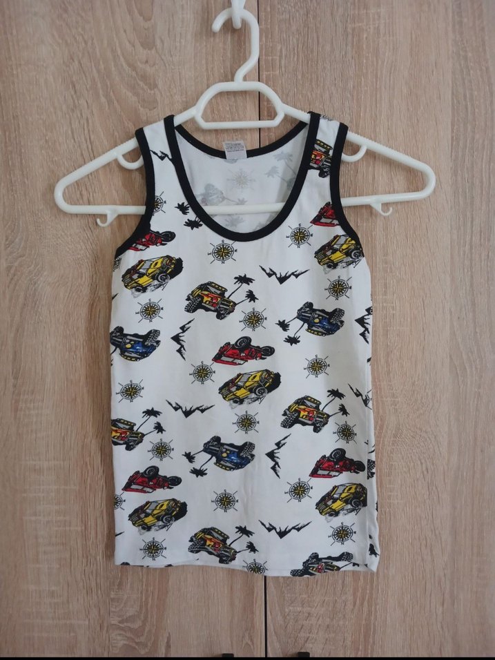 Beyaz zemin üzerine renkli baskılı araba desenleri bulunan, siyah yaka ve kol kenarları detaylı çocuk atlet