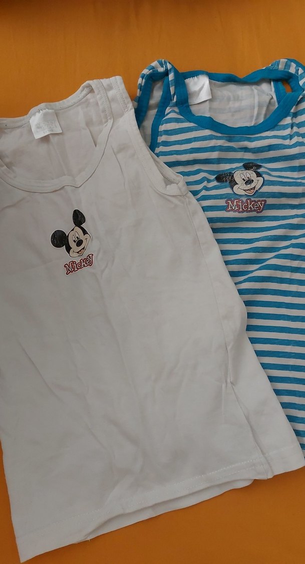 Renkli Mickey baskılı, beyaz ve mavi çizgili iki çocuk atlet. Üzerlerinde "Mickay" yazısı bulunur.