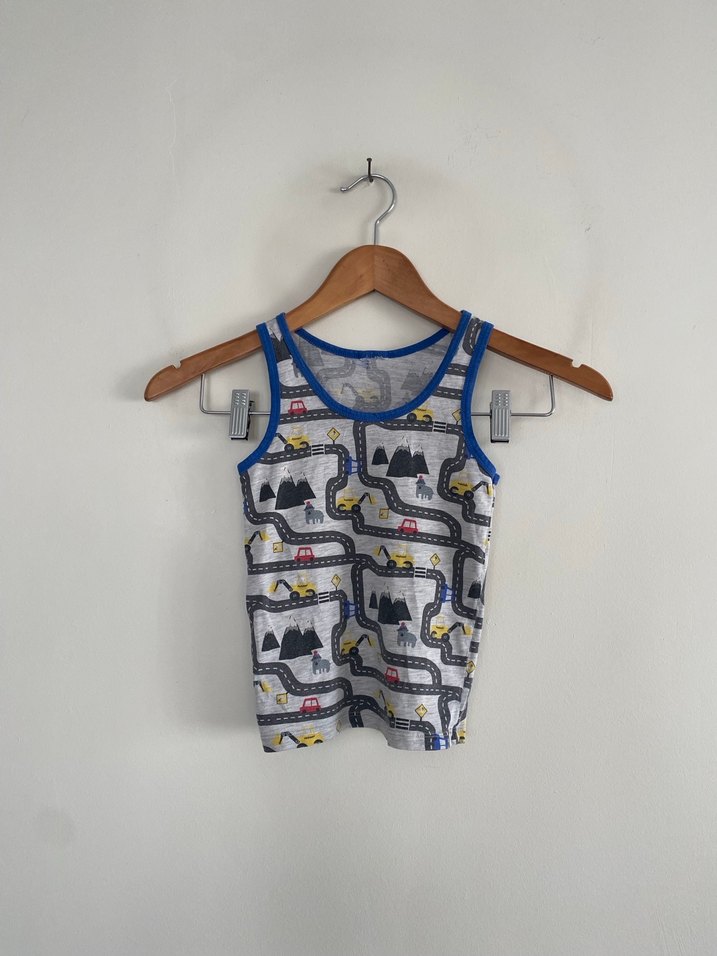 Çocuklar için gri zeminde yol ve dağ desenli baskılı, mavi kenarlıklı, kolsuz hafif atlet.