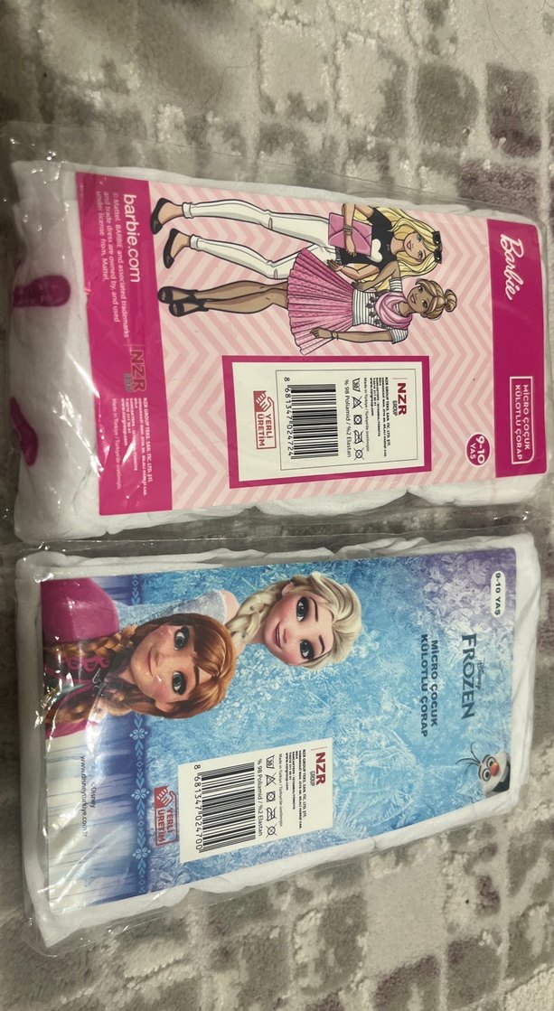 çocuk külotlu çoraplar, Barbie ve Frozen karakterli baskılara sahiptir. Plastik malzemeden yapılmış, canlı renklerde ve desenlidir. 9-10 beden.