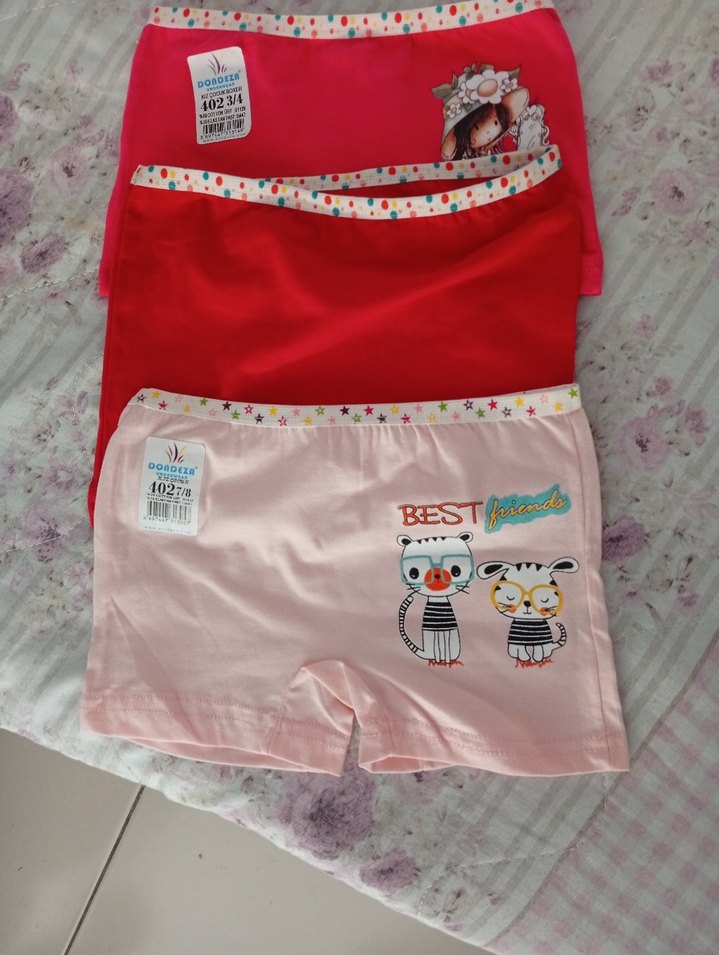 Pembe ve kırmızı tonlarda baskılı çocuk iç çamaşırları, sevimli karakter desenleri ve rahat lastikli bel bantlarıyla.