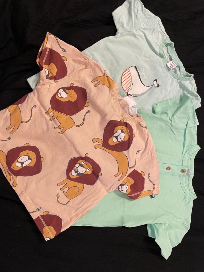 Aslan ve balina desenli, pastel tonlarda çocuk tişörtler. Yumuşak ve rahat kumaştan üretilmiştir.