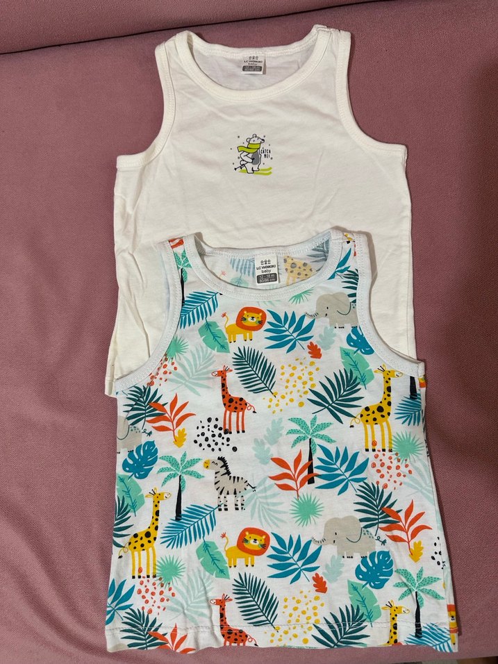 Beyaz küçük kurbağa baskılı ve çok renkli hayvan desenli yaprak baskılı iki adet çocuk atleti. Hafif ve rahat kumaş.