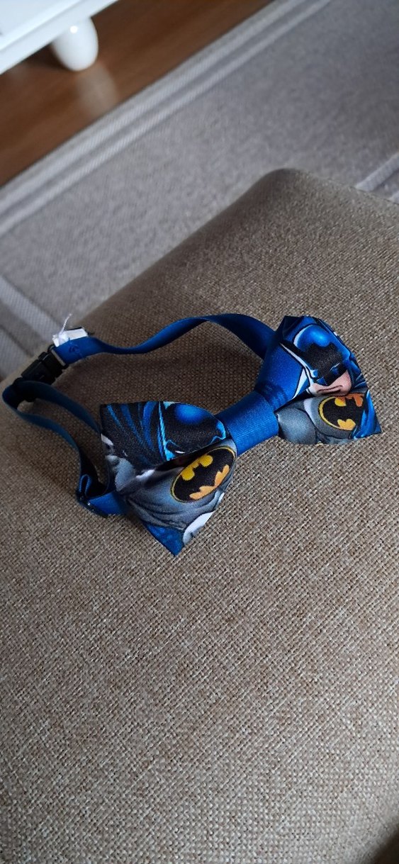 Sentetik kumaştan yapılmış, baskılı Batman desenli mavi papyon, çocuklar için rock punk tarzını yansıtır.