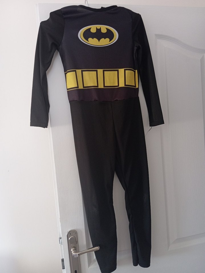 Siyah, uzun kollu, yüksek yakalı çocuk kostümü, Batman logosu ve sarı kemer baskısı ile bel detaylıdır.