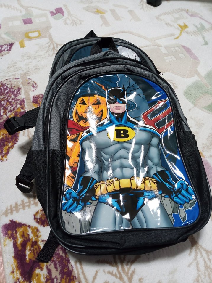 Koyu renkli, çok renkli çocuk okul çantası. Ön cephesinde Batman figürü bulunur, ayarlanabilir askıları ve çoklu bölmeleri vardır defterler boya kalemleri birlikte