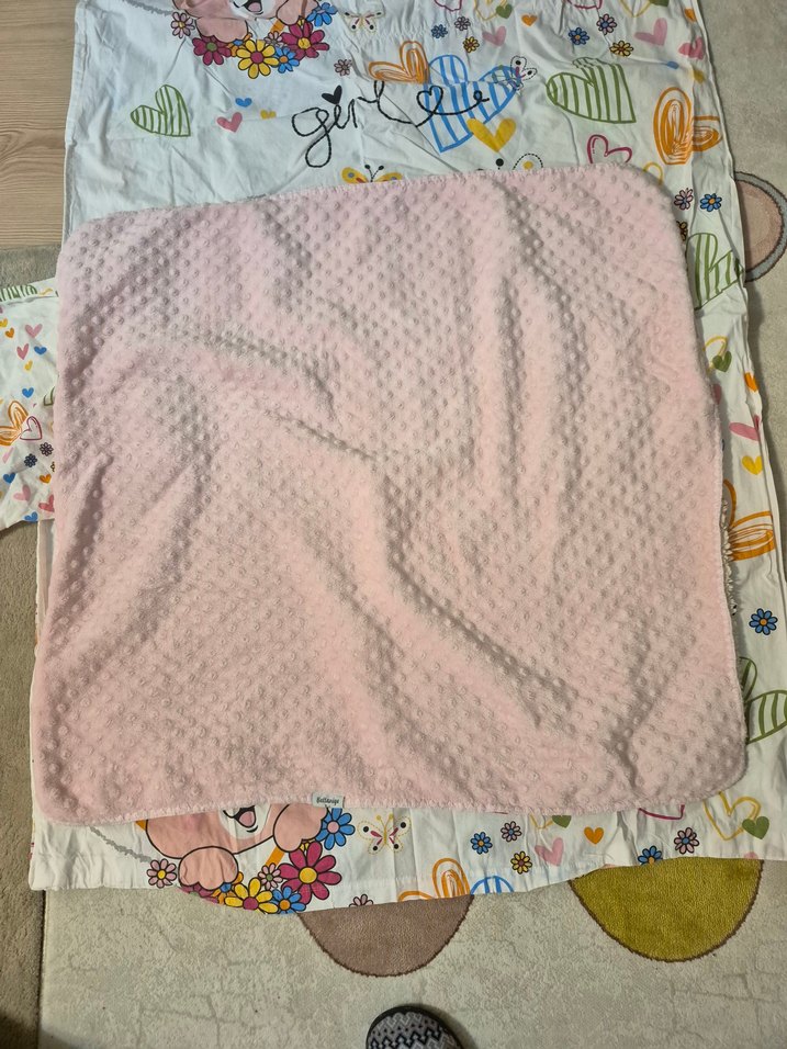 Pastel pembe renkte, yumuşak kumaştan yapılmış, desen içermeyen çocuk battaniyesi, rahat sıcaklık sağlar.