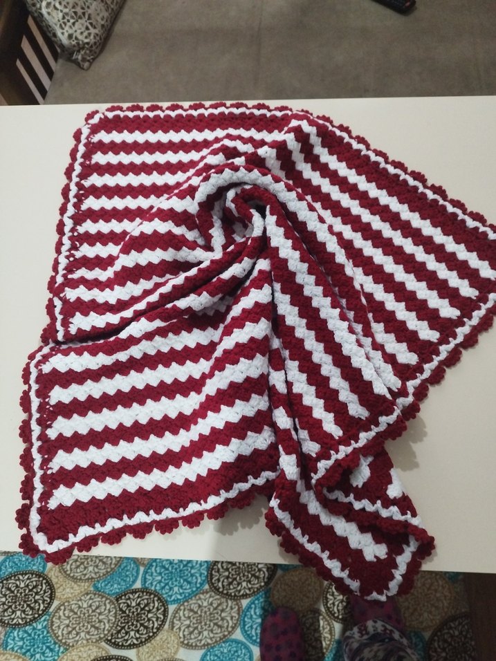 Bordo ve beyaz çizgili, yumuşak örgü kumaştan yapılmış çocuk battaniyesi, sıcaklık sağlar. 80*85 ölçüsü.yeni örüldü sıfır kullanılmamış.