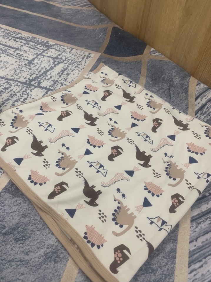 Yumuşak sentetik kumaştan yapılmış, gri ve kahverengi tonlarda baskılı desenli çocuk battaniyesi.