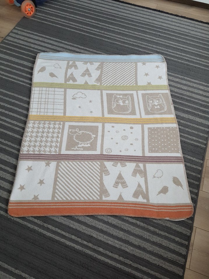 Çocuklar için yumuşak ve sıcak bir kumaşa sahip, gri ve çok renkli baskılı desende battaniye. Rahat kullanım sağlar. kenar iplerinde cikmalar var