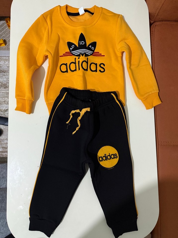 Erkek çocuklar için bol kesim, sarı renkli crew neck üstünde adidas baskılı, siyah altı sarı detaylı velcro bağlamalı eşofman takımı. Yumuşak ve sıcak kumaş, günlük sokak stili için uygundur. SIFIR ÜRÜN İÇİ ŞARDONLU