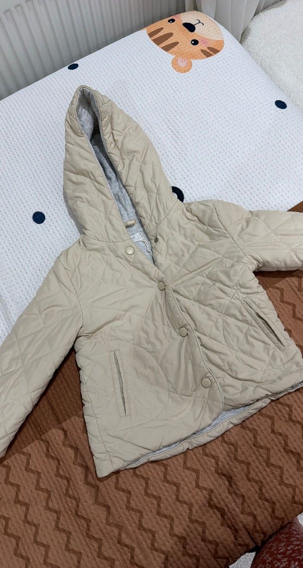 çocukları için bej rengi, düğmeli ve kesimli yakalı ince sentetik kumaştan yapılmış sade ve desen içermeyen ceket.