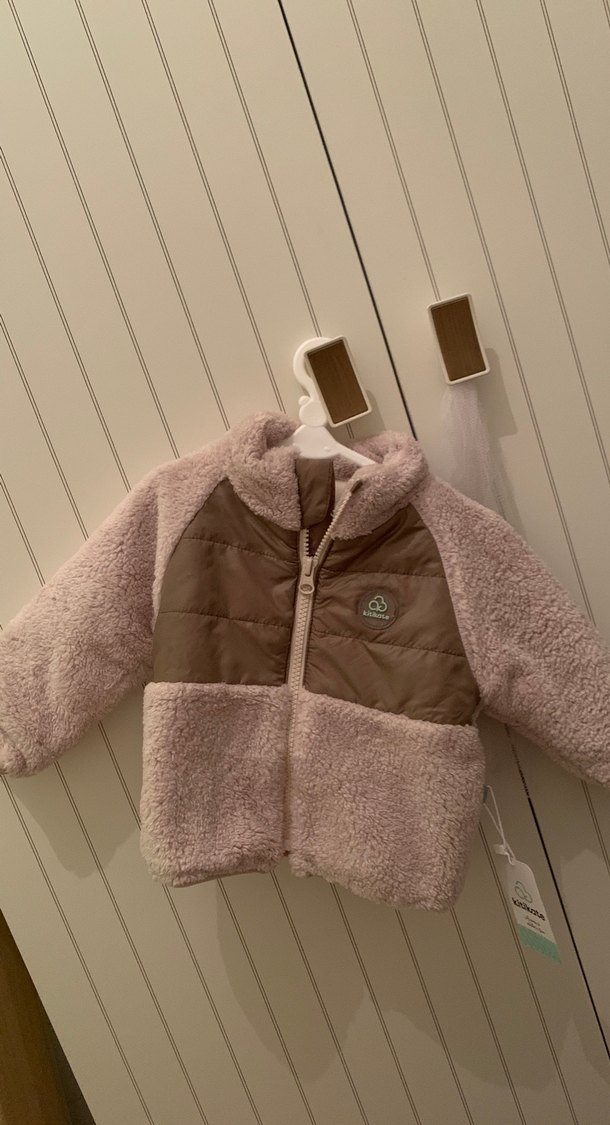 çocuk için pastel bej renkte, kürklü detaylı, yumuşak ve sıcak kumaştan yapılmış, kesimi vücuda oturan, yakası kesik yaka olan ceket.