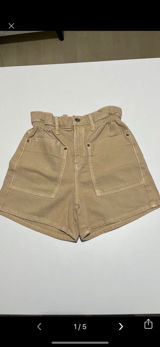 Çocuklar için keten kumaştan yapılmış bej renkli, yüksek bel, kemerli ve bol kesim mini şort. Büyük ön cepleriyle günlük sokak stiline uygun rahat bir model.