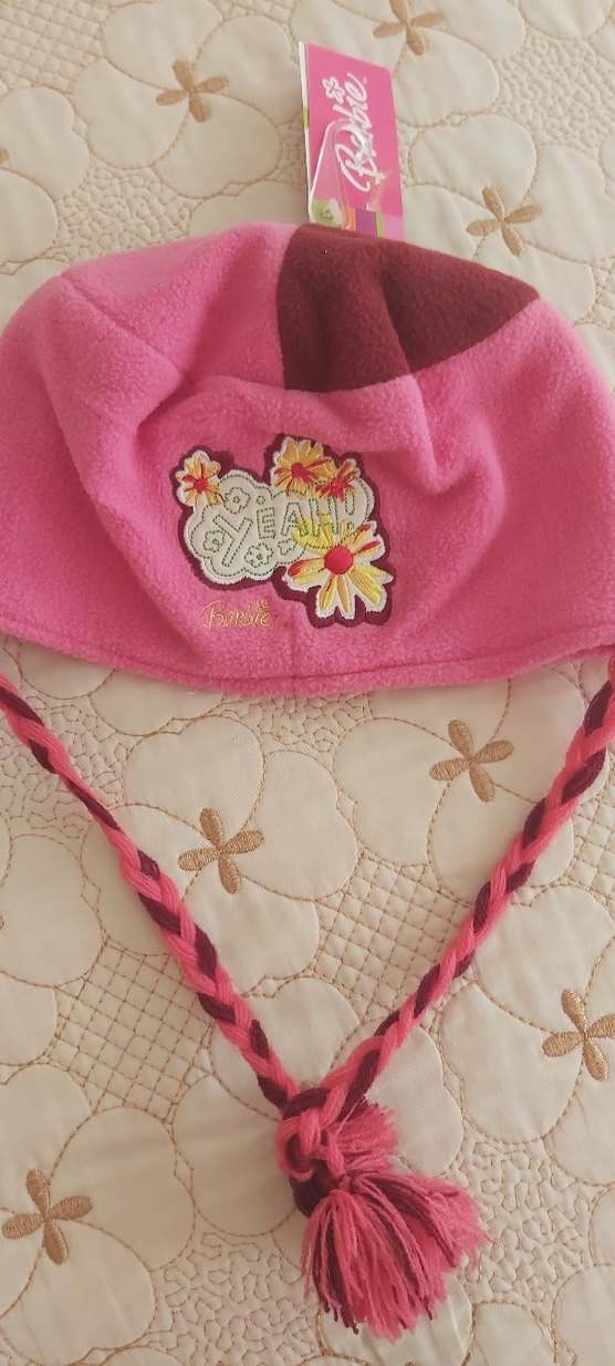 Çiçek nakışlı ve örgü detaylı renkli pembe çocuk bere, yumuşak ve sıcak bir kumaşla retro hippie tarzını birleştiriyor.